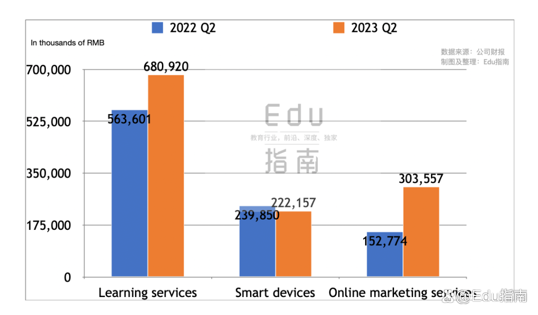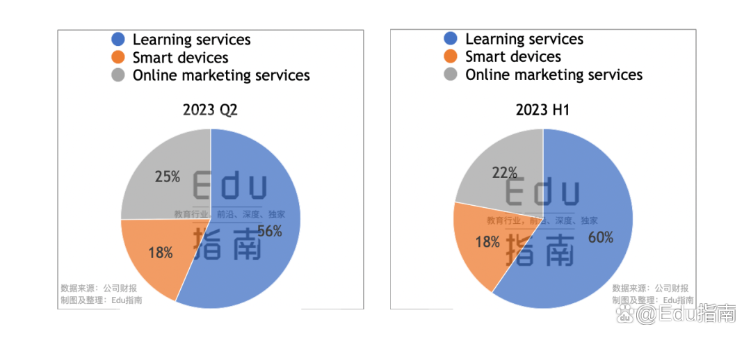 从收入占比来看,该公司2023年Q2学习服务、智能硬件收入占比分别为56%、18%,两部分业务累计占比74%,在线营销服务季度收入占比为25%。上半年其学习服务、智能硬件收入占比分别为60%、18%,两项业务分部累计占比78%,在线营销服务上半年收入占比为22%。