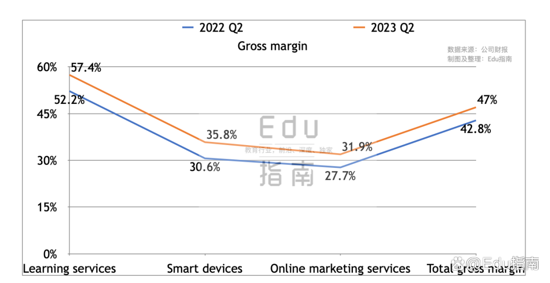 根据财报,该公司二季度整体毛利率为47%。其中学习服务毛利率为57%,高于上一财年Q2的52%。根据季报,该业务毛利率增长是因为其学习服务收入增长、规模经济效益提升等。