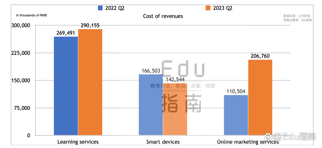 其中本季度该公司学习服务收入成本为2.9亿元,同比增幅为8%。Q2学习设备收入成本为1.4亿元,同比下降14%。在线营销服务收入成本为3.6亿元,同比增幅为87%。
